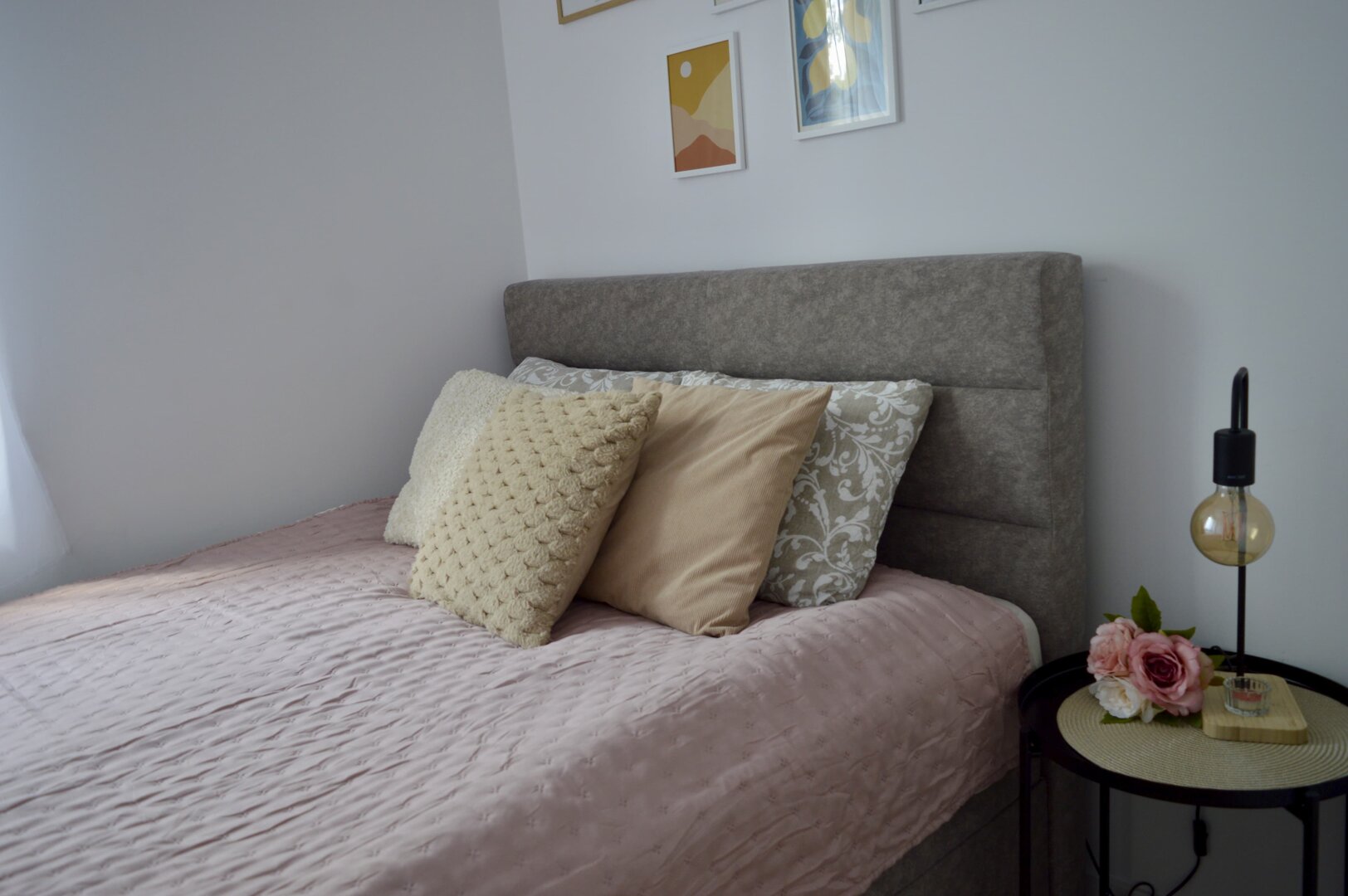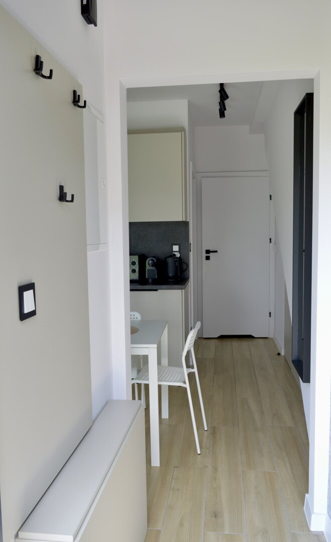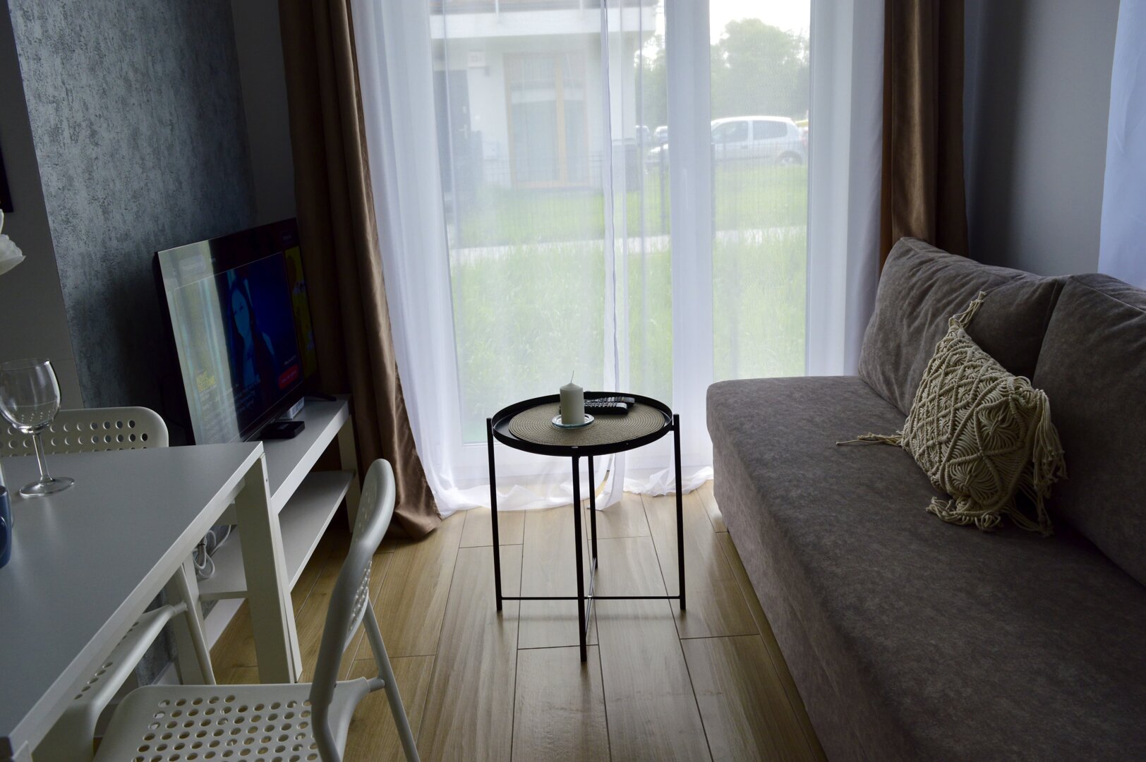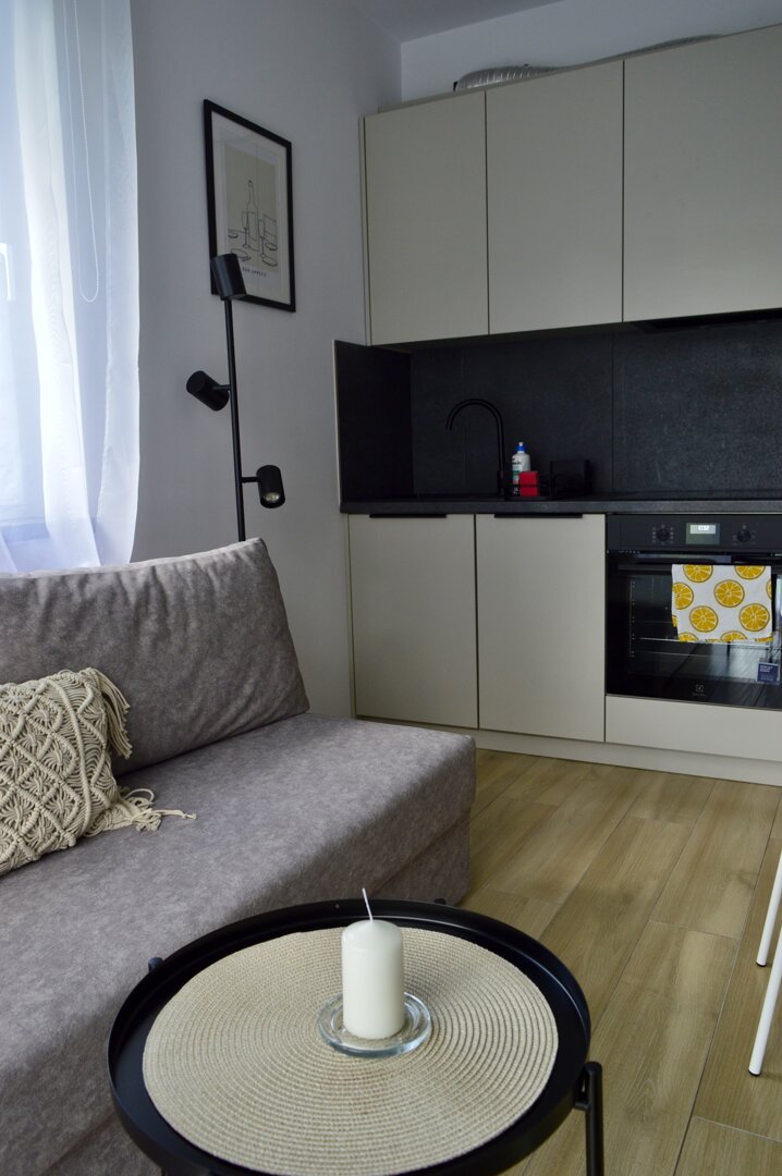 Apartament składa się z przytulnej, zamykanej sypialni, która gwarantuje komfortowy sen i prywatność, oraz jasnego salonu z wygodną kanapą, idealnego do relaksu po dniu pełnym wrażeń. Do dyspozycji gości jest również nowoczesna łazienka oraz w pełni wyposażony aneks kuchenny, który pozwala na przygotowanie ulubionych posiłków.