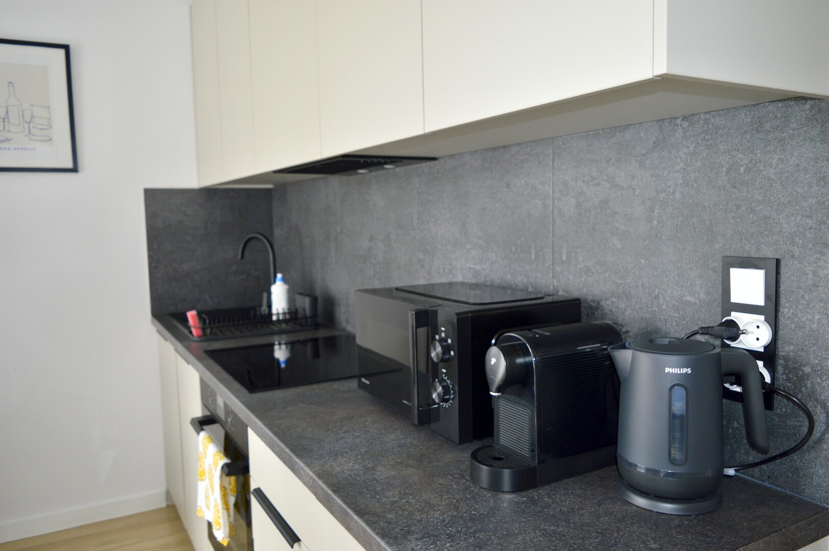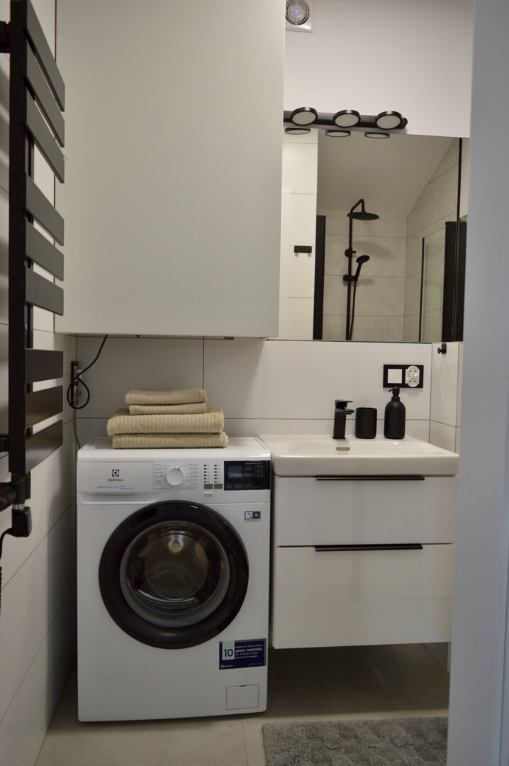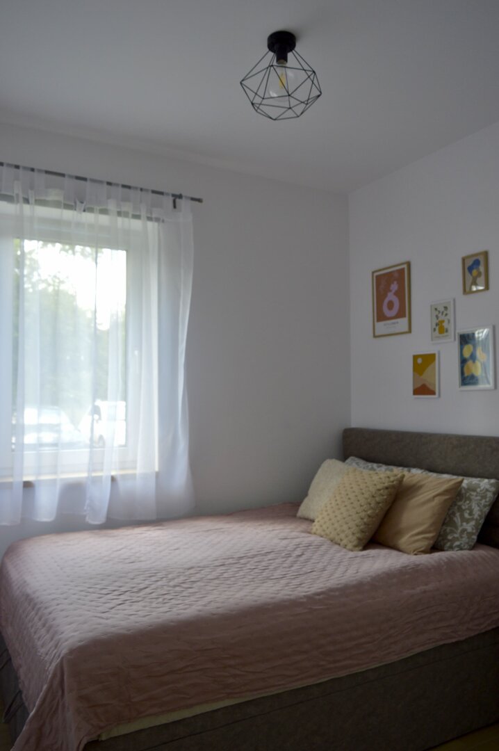 Apartament składa się z przytulnej, zamykanej sypialni, która gwarantuje komfortowy sen i prywatność, oraz jasnego salonu z wygodną kanapą, idealnego do relaksu po dniu pełnym wrażeń. Do dyspozycji gości jest również nowoczesna łazienka oraz w pełni wyposażony aneks kuchenny, który pozwala na przygotowanie ulubionych posiłków.